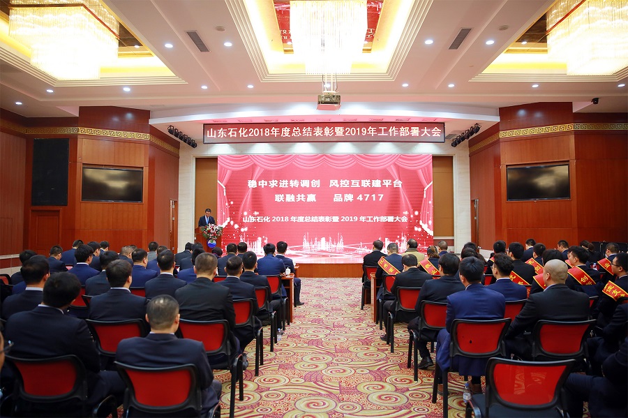1月25日,山東石化“穩(wěn)中求進轉(zhuǎn)調(diào)創(chuàng),風控互聯(lián)建平臺,聯(lián)融共贏,品牌4717”2018年度總結(jié)表彰暨2019年工作部署大會在濟南隆重召開。大會全面總結(jié)了山東石化2018年度工作完成情況,重點部署2019年度工作任務,并對2018年度涌現(xiàn)出的先進個人、團隊進行表彰。山東省市場監(jiān)督管理局、山東省工信廳、山東省商務廳、山東京博控股集團等相關(guān)領導應邀出席本次大會。