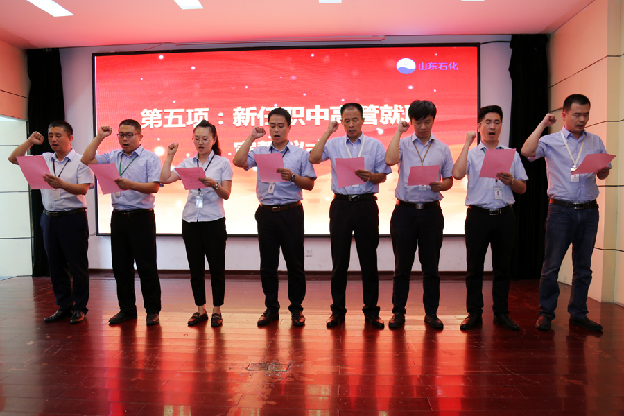隨后,舉行山東石化新聘中高層就職宣誓儀式。他們將繼續(xù)忠于黨、忠于祖國,忠于公司,恪盡職守、廉潔奉公,接受員工、客戶及社會監(jiān)督,為山東石化使命與愿景而努力奮斗!