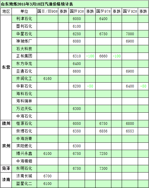 2015年3月18日山東地煉汽油價格