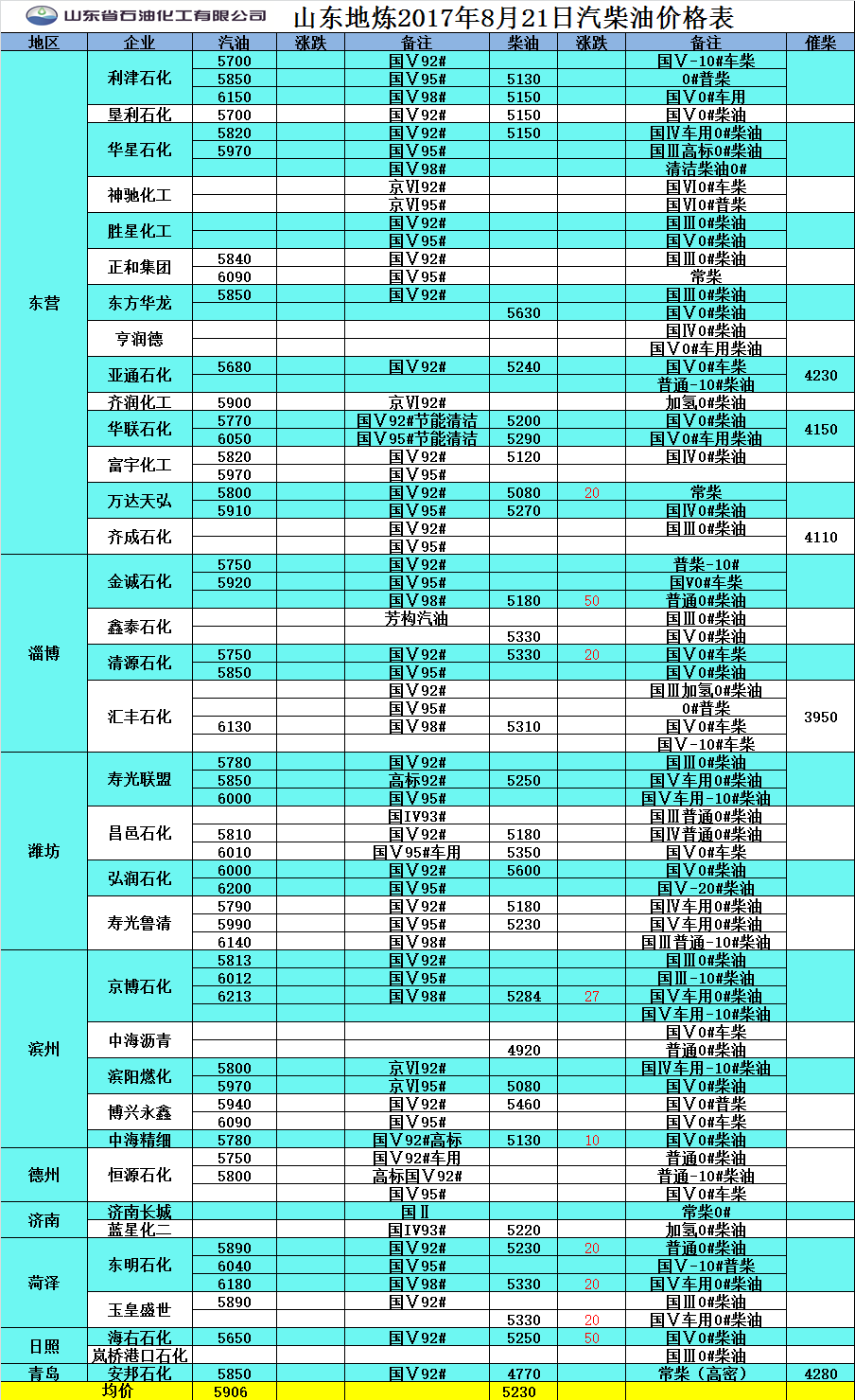 山東地煉2017年8月22日汽柴油價格表