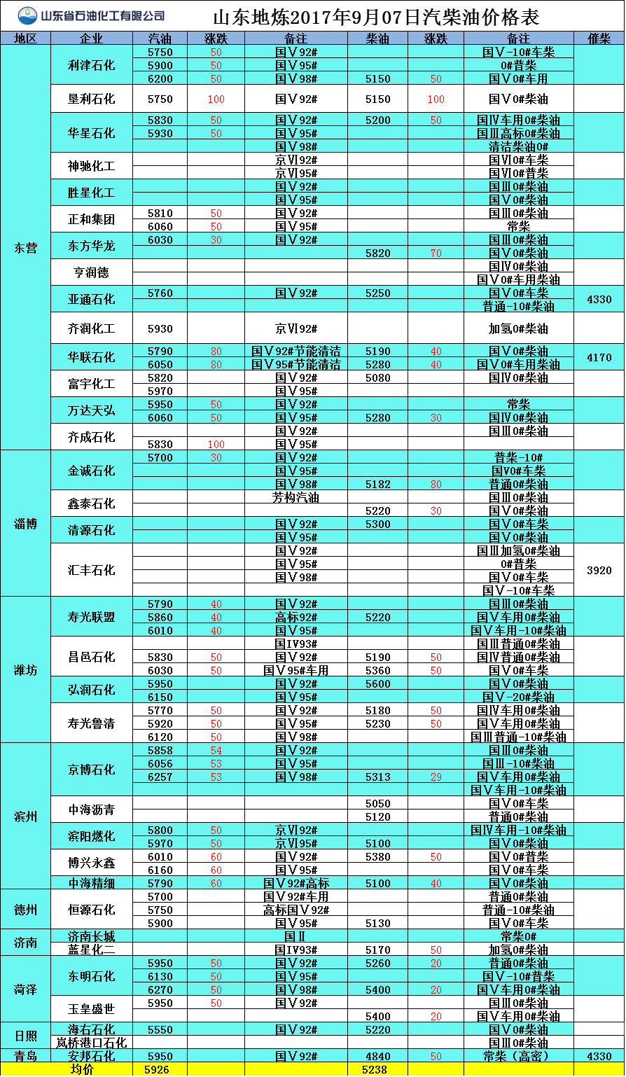 山東地?zé)?017年9月07日汽柴油價格表