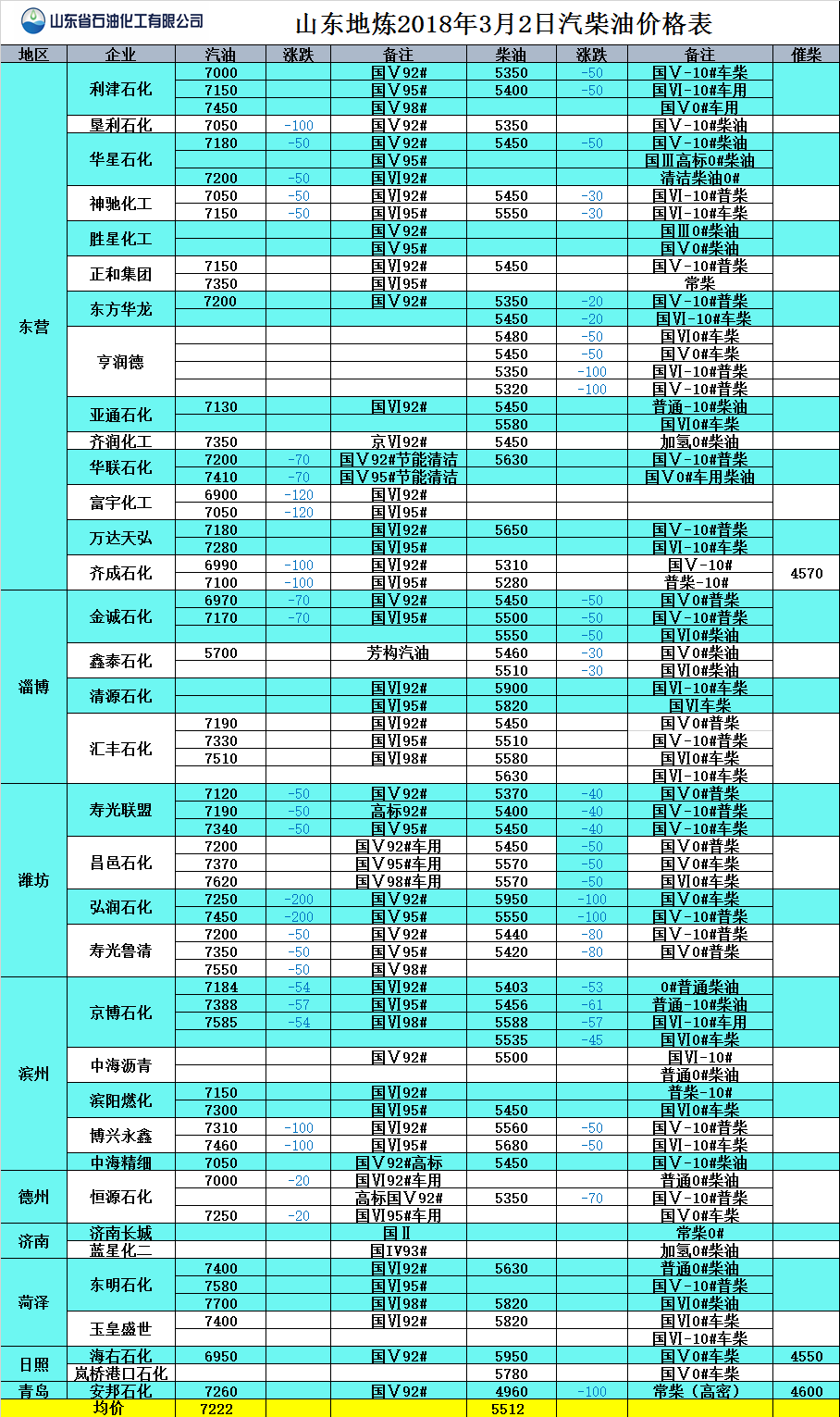 山東地?zé)?018年3月1日汽柴油價格表