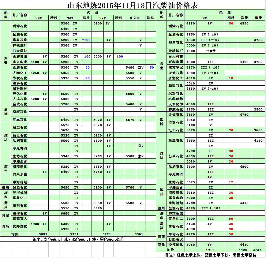 2015年11月18日山東地煉汽柴油價格表
