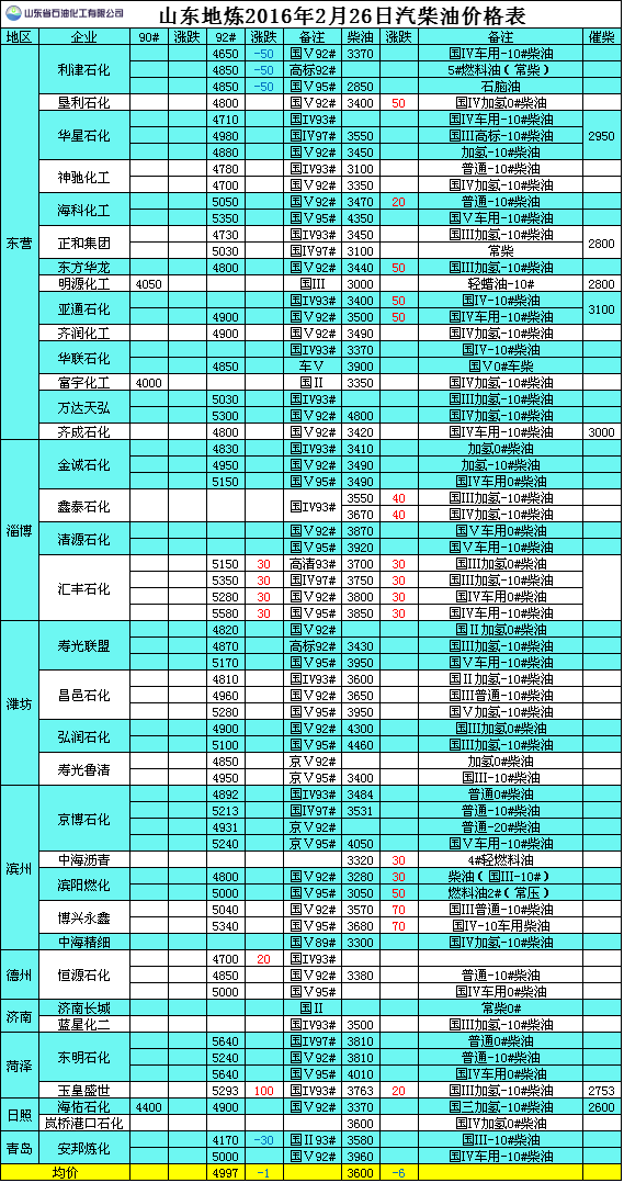 2016年2月26日山東地?zé)捚裼蛢r格表