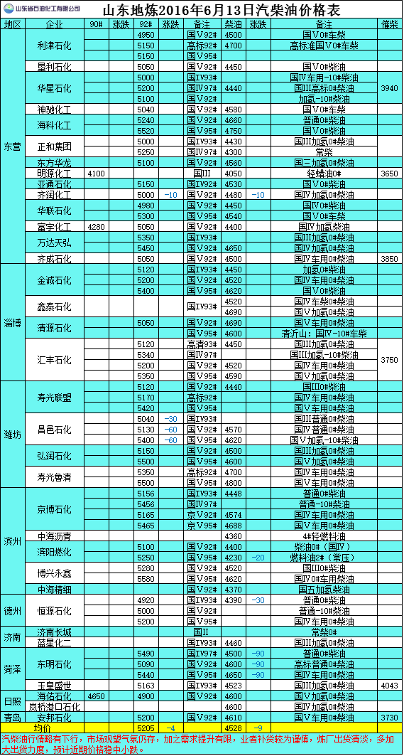 2016年6月13日山東地煉汽柴油價格表