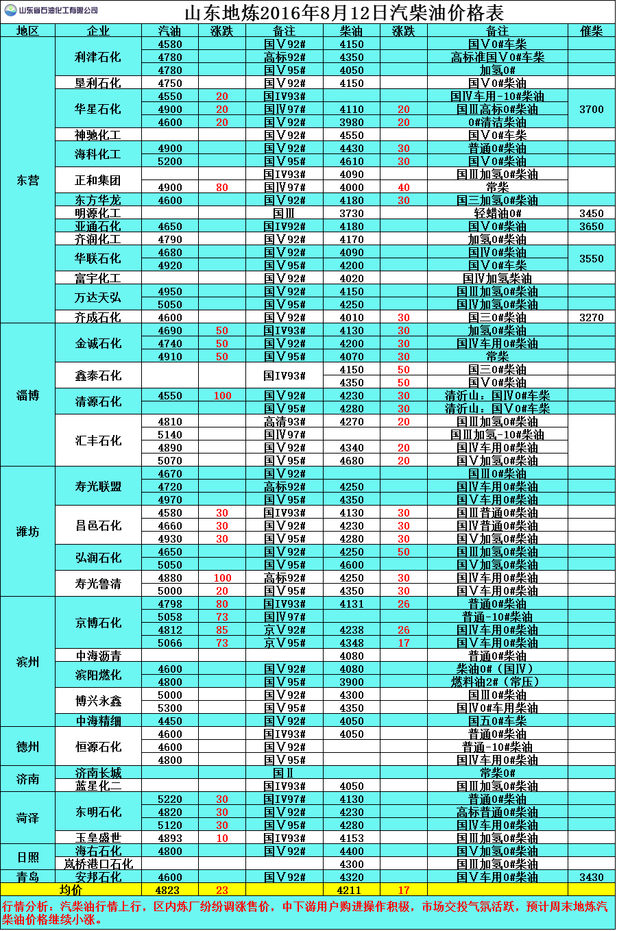 行情分析:汽柴油行情上行,區(qū)內(nèi)煉廠紛紛調(diào)漲售價(jià),中下游用戶購進(jìn)操作積極,市場(chǎng)交投氣氛活躍,預(yù)計(jì)周末地?zé)捚裼蛢r(jià)格繼續(xù)小漲。