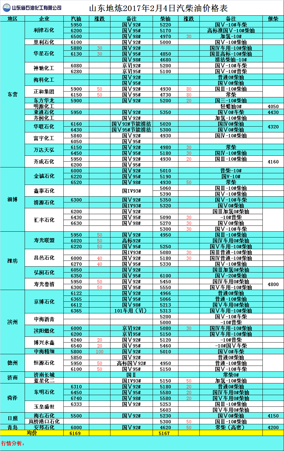 2017年2月4日山東地煉汽柴油價格