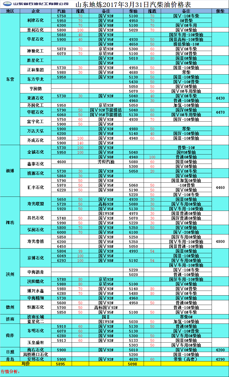 2017年3月31日山東地煉汽柴油價格