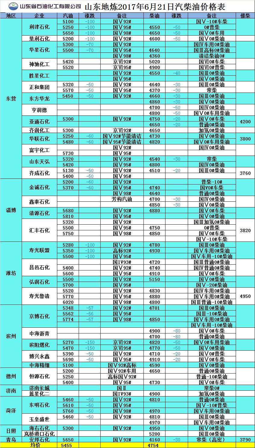 2017年6月21日山東地煉汽柴油價格